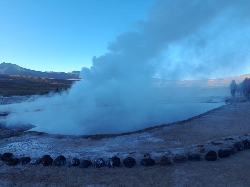 O trajeto é de mais ou menos uma hora e ao chegar nos Geiser tem que pagar uma entrada de 15.000 CLP. Caminhamos pelo campo, tiramos um momento nossos sapatos para sentir o calor do chão, uma sensação muito bem-vinda já que quando fomos tinha -9°C . O guia explicou como o campo geotérmico tem origem vulcânica onde a água e o vapor irrompem violentamente das profundezas da terra.